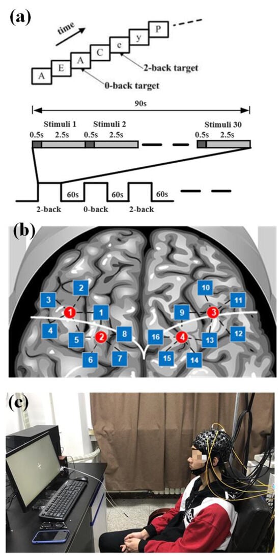 The experimental paradigm consisted of two tasks: 2-back and 0-back. In both tasks, a letter appeared on a screen at the same time, and the subjects were asked to make a judgment. In the 2-back task, subjects needed to judge whether the current letter was the same as the letter that appeared next to it. If the letter was the same, they were asked to press the left mouse button; if not, they pressed the right mouse button. In the 0-back task, the subjects only needed to judge whether the current letter was “A”; if it was, they should press the left mouse button; otherwise, they should press the right mouse button. The experimental process is shown in Figure 5a. There were six blocks in the experiment; each block lasted 90 s, including 30 trials. The 2-back task and 0-back tasks were shown alternately. In each task block, ten letters were set as yes cases. The rest period lasted 60 s between the blocks. In the task, subjects were presented with a sequence of 30 letters. Each letter was presented for 500 ms, and there was a 2.5 s interval during which the screen was blank. Before the experiment began, the task requirements were explained to the subjects, and then the task exercises were performed to ensure that the subjects could achieve more than 70% accuracy in the exercise task.