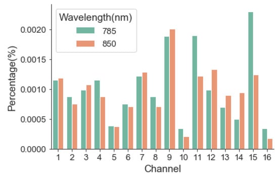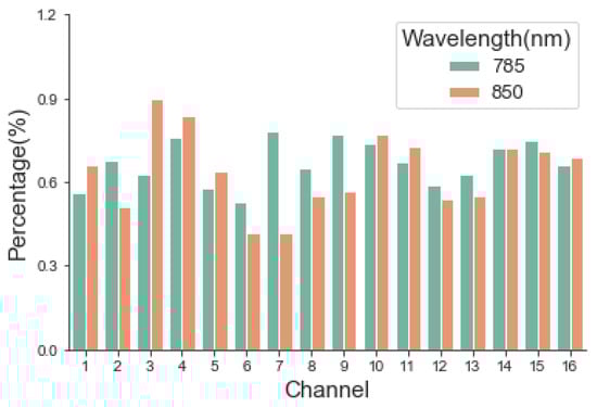 In the experiment, U1 and U2 were measured for 8 min. The maximum background light interferences of all channels are shown in Figure 7. The background light interference degree could be calculated as less than 1%.