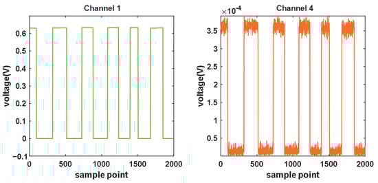Inter-channel interference (Figure 8) showed that turning on and off the light source (Channel 1) has an influence on the adjacent channel (Channel 4), but the influence range is 10−4 V, which is neglectable compared with the measurement signal of 10−1 V.