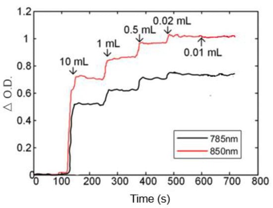 Figure 9 shows the real-time recording of the optical density value during the experiment. As the experiment continued to add samples, the optical density curve had an obvious upward trend. This phenomenon continued until 0.1 mL was added. At this time, the curve change was not obvious. Therefore, in terms of sensitivity, this system can detect at least 0.2% changes in hemodynamic concentrations.