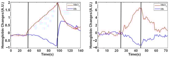 The experimental results are shown in Figure 10a. In the 30 s of the experiment, blood flow was constrained by inflating and pressurizing the sleeve bag. As the tissue cells continued to consume oxygen, the content of oxygenated hemoglobin and deoxygenated hemoglobin in the measured blood gradually decreased. When the vascular occlusion is deflated and decompressed at 90 s, the influx of fresh blood causes the two hemoglobin levels to resume to baseline gradually.