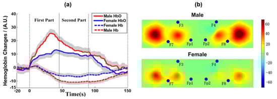 Gender differences in brain function varied with task stages (Figure 11), consistent with prior studies. The 90 s block was divided into two 45 s data segments. The fNIRS brain activation in the two segments was analyzed, respectively. The results showed that the sex difference of HbO2 mainly existed in the anterior segment. The HbO2 concentration of the prefrontal cortex (PFC) in male subjects increased quickly at the beginning of the task, exceeded that of female subjects, and began to decline about one-third of the way through the task, then approached that of female subjects in the second half. This phenomenon indicated that males need more time to adapt to this task, so they need to call more brain resources and have stronger brain activation in the early stage, and the brain activation level declined after the subjects began to adapt to this task. In women, the brain activation curve remained flat throughout the tenure. It also suggested that women are more suitable for such experiments because of their efficient adaptability. The possible reason from the perspective of heredity and natural evolution is that females usually use symbols to mark information, while males are good at using spatial location to mark information [23].