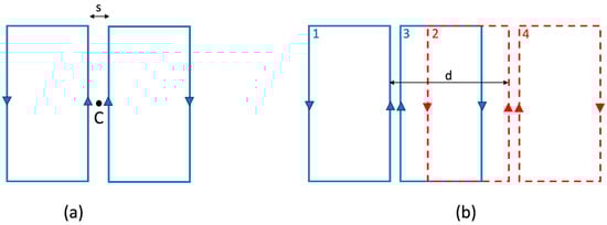 (a) Two rectangular RF coils with counter-rotating currents, used to schematize a rFO8 RF coil with symmetric rectangular return paths. Point C represents the geometrical center of the two central current paths separated by the distance s. (b) Two identical and symmetric rFO8 coils with the central current elements shifted by the distance d.