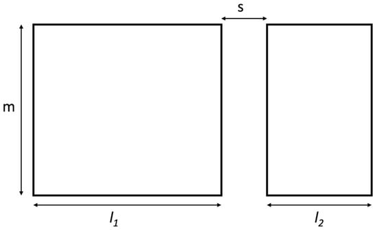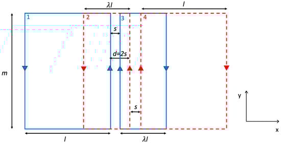 To calculate the mutual inductance of two rFO8 coils, we start from the analytical expression for the mutual inductance [13] of two coplanar rectangular current loops of equal height positioned on a plane, as shown in Figure 2:
