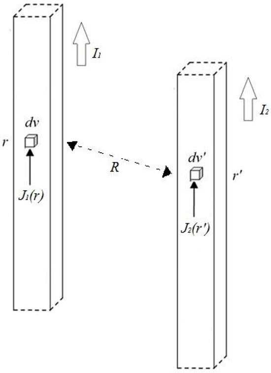 where and represent the total currents in volumes V1 and V2, respectively, and R = |r-r′| (Figure 3).