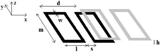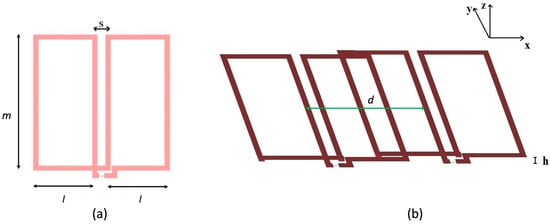 The mutual inductance between two rFO8 coils, each represented with a couple of identical rectangular loops laying on parallel planes with the distance between them equal to h (Figure 4), can be calculated with Equation (3) by considering the direction of the currents flowing in the conductors.