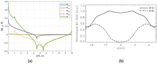 First, let us consider two identical rFO8 coils with sizes cm, cm, and cm. Since the two constitutive loops of each coil have equal size and we will refer to them as symmetric rFO8. The mutual inductances among the loops, as well as the total mutual inductance among the rFO8 coils, are reported in Figure 6. We observe that can be obtained when cm. The result demonstrates that decoupling can be obtained for two identical and symmetric rFO8 coils, but its practical applicability is questionable. The reason is that when , the central current elements of the two rFO8 coils are quite distant and the RF field sensitivity profile along the x-axis develops a void, making the whole system of little use for MRI applications. An example is reported in Figure 6b, showing an acceptable magnetic field B1 distribution in the central ROI (z = 10 cm) along the transverse x-direction for d = 2s = 2 cm, while a broad void is present at the center for d = 6s = 6 cm.