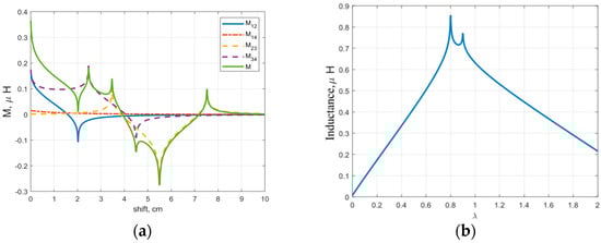 Analytical calculations: (a) total mutual inductance M and its components for two rFO8 coils with cm, cm, cm, and 5; (b) total mutual inductance M as a function of for cm, cm, and cm.