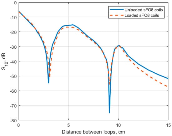 Using the same geometry as in Section 3.3, we computed the parameter as a function of for MHz (Figure 10). For the unloaded rFO8 coils, coupling is minimized (−55 dB) for .0 cm, close to the results obtained with both the magnetostatic (.25 cm) and analytical (.14 cm) approaches. As shown in Figure 10, at the frequency considered in the simulations, the load has a small impact on the values, with a tiny displacement of the optimal decoupling condition towards larger shifts (unloaded: −54.9 dB at d = 3.0 cm; loaded: −51.2 dB at d = 3.1 cm).