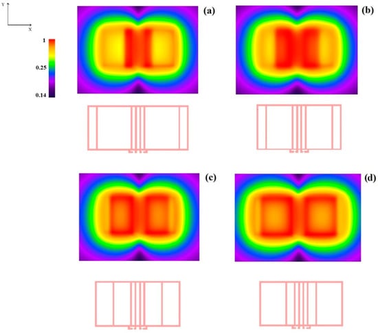 Figure 11 shows the modulus of the field maps obtained from the FDTD simulations in the x–y plane for z = 10 mm above the upper coils plane. We observe that the central region, corresponding to the four straight parallel current elements with spacing s, becomes less homogeneous for increasing asymmetry index values (smaller λ values) due to the closer proximity of the return paths.