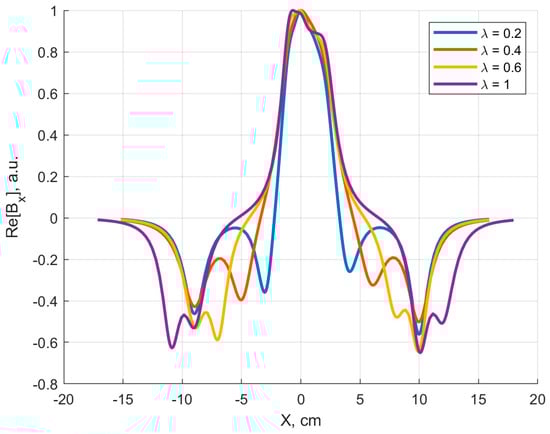To visualize the RF magnetic field distribution, we calculated the profile of the real part of the x component of the B1 field along a line parallel to the x axis that halves the coils (y = 0) for z = 10 mm. The results for different λ values are reported in Figure 12, where it is evident that the central lobe amplitude is reduced when large coils’ asymmetry is present (λ = 0.2, 0.4).