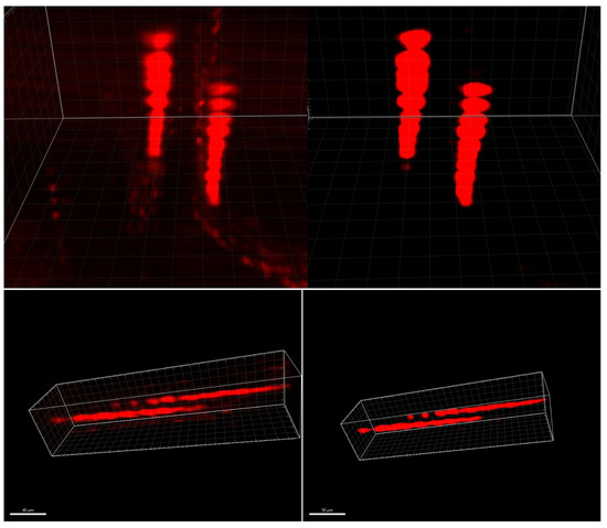 Two neurons, original 3D stack (left) and distortion-corrected stack (right), reconstructed by using Imaris 9.5, Oxford Instruments (Abingdon-on-Thames, United-Kingdom). The two neurons are elongated along the z-axis, vertically on the top, and horizontally on the bottom.
