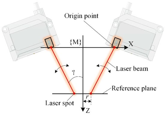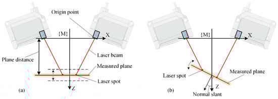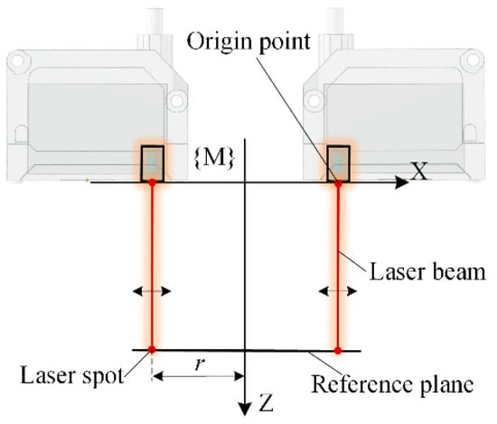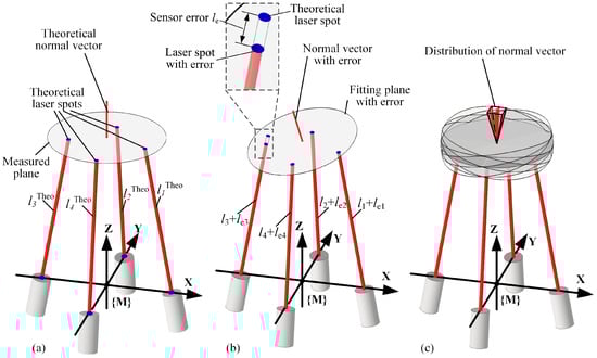 The measurement value of laser sensors participates in the normal calculation process directly, and the existence of any sensor measurement error inevitably leads to the fitting error of the normal vector. As shown in Equation (3), the sensor error lie initially causes the coordinate error of the laser spot Pie.