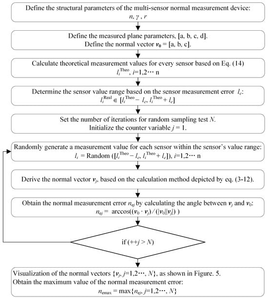 This is shown in Figure 3a. After obtaining the theoretical measurement value for sensors, a random measurement error within the sensor error range is selected for each sensor. The laser spots calculated with sensor values that include measurement errors also carry coordinate errors, which lead to a discrepancy between the fitted normal vector and the theoretical normal of the measured plane, resulting in normal measurement errors, as depicted in Figure 3b. Repeating the process of the random sampling of sensor measurement errors and recomputing the normal vectors, a group of varying normal measurement results with different errors are gradually obtained, as illustrated in Figure 3c. Furthermore, as the continuous sampling of diverse instances within the sensor error range is conducted to compute normal vectors, the accumulated normal measurement results progressively approximate the actual distribution of measurement errors, and the maximum normal measurement error nemax indicates normal measurement accuracy. The complete process of the normal measurement error estimation method based on random sampling is illustrated in Figure 4.