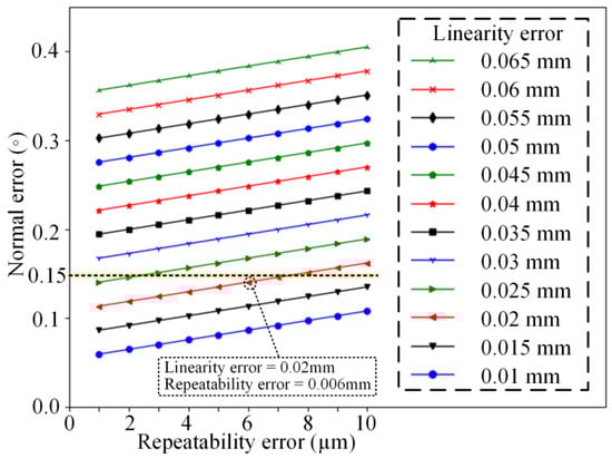 For a multi-sensor measurement device, the normal measurement error caused by sensor errors is not affected by the position or attitude of the measured plane. The reference plane of the normal measurement device is set as the measured plane when the influence of other factors on the normal measurement accuracy is investigated. The measurement error of the laser displacement sensor, including the linearity error and repeatability error, has the most direct impact on the normal measurement accuracy. A normal measurement device is constructed using four laser displacement sensors arranged in a rotationally symmetric layout, where the laser beam slant angle γ is set to 0°, the laser spot distribution radius r is set to 15 mm, and the measurement range of the laser sensor set to 100 mm ± 30 mm. The sensor linearity error is calculated based on the linear accuracy and the measurement range given by Equation (3), selecting the linearity error within the region of [0.01 mm, 0.065 mm] and the repeatability error within the range of [0.001 mm, 0.01 mm]; the influence patterns of sensor measurement errors on the normal measurement accuracy are analyzed by the proposed random sampling simulation method, which is shown in Figure 8.