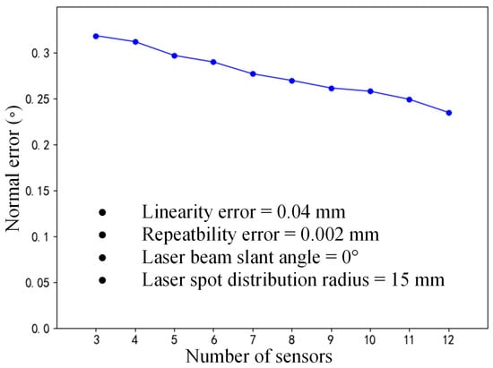 The multi-sensor normal measurement device with a rotationally symmetric layout has sensors evenly distributed around the Z-axis of the measurement coordinate system, and sensor quantity directly affects the position of each sensor. The measurement range of the laser displacement sensor is set to 100 mm ± 30 mm, with a linearity of 0.15% f.s. and a repeatability error of 0.005 mm. With the laser beam slant angle of the measurement device set to 0° and the laser spot distribution radius set to 15 mm, the influence pattern of the sensor quantity on the normal measurement accuracy can be analyzed, as shown in Figure 9.