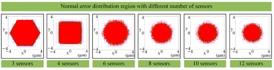 With an increase in the sensor quantity, the normal measurement accuracy gradually improves, as shown in Figure 9. Furthermore, the spatial distribution of the normal measurement error is obtained based on the simulation analysis method with the random sampling of sensor errors. As shown in Figure 10, when using three sensors, the cross-section of the normal error distribution approximates a hexagon; when using four sensors, the normal error distribution has a square-like cross-section; and as the sensor quantity increases continuously, the spatial distribution of the normal error is similar to that of a circle. Although normal vectors are inherently dimensionless, a length of 1 mm is assigned to each normal vector, as visualized in Figure 10. Based on this representation, it becomes visually apparent that a smaller-size normal vector distribution region corresponds to a higher normal measurement accuracy.
