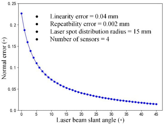 The direction of the laser displacement sensor is determined by the laser beam slant angle, which is a key parameter in calculating the laser spot coordinate, as shown in Equation (3). Four laser sensors with a measurement range of 100 mm ± 30 mm were selected to constitute a normal measurement device, with a linearity of 0.15% and a repeatability of 0.005 mm. The laser spot distribution radius r of the measurement device was set to 15 mm, and the laser beam slant angle γ increased from 0° to 45°, as shown in Figure 11. The proposed simulation method based on random sampling was used to obtain the varying pattern of the normal measurement error.