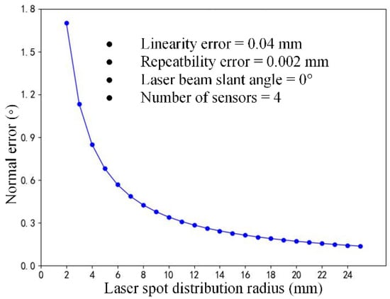 The effect of the laser spot distribution radius on the normal measurement error is shown in Figure 14. As the laser spot distribution radius increased gradually from 2 mm, the normal measurement accuracy experienced a significant enhancement, albeit with a concomitant gradual decline in the rate of improvement.