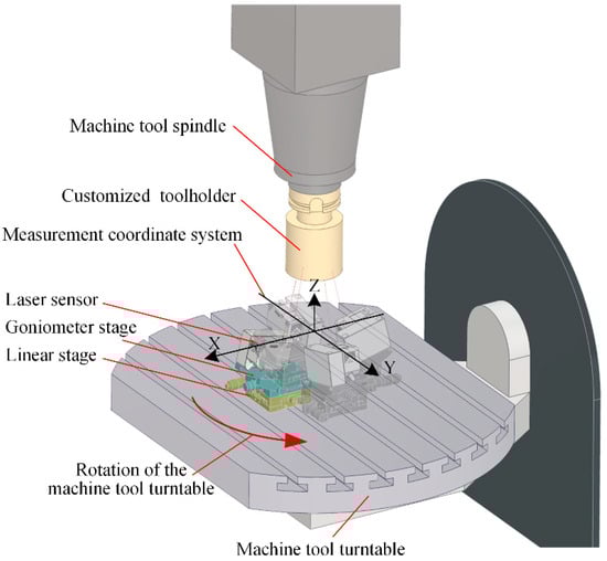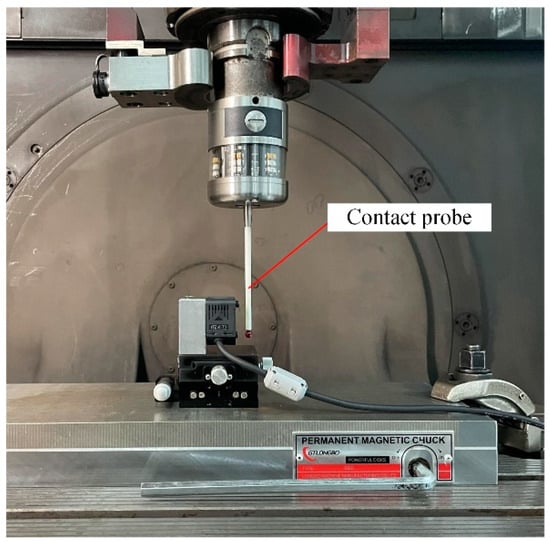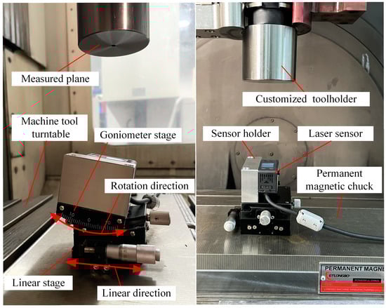 Before the normal measurement test, it was necessary to accurately adjust the position and posture of the point laser sensor based on the theoretical values of the laser beam slant angle and laser spot distribution radius of the multi-sensor measurement modules used in the experiment. As shown in Figure 18, during the installation and adjustment of the 2-DOF platform, the contact probe equipped on the machine tool was used to measure the installation surfaces on the platform and the sensor holder directly, ensuring that the sensor installation was in accordance with the theoretical pose.