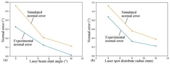 Experiment and simulation results of the normal measurement accuracy. (a) Normal measurement accuracy influenced by the laser beam slant angle. (b) Normal measurement accuracy influenced by the laser spot distribution radius.
