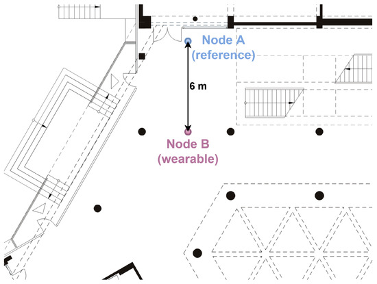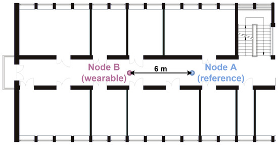 A man weighing 71 kg and 187 cm tall participated in the measurements. The wearable node was placed on his belt at a height of 110 cm, and the reference node was placed on a tripod stand, also at the height of 110 cm.