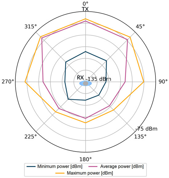 For each stored impulse response consisting of 1016 complex values, additional information was also available, such as the value of the total signal power of the CIR and the power of the first component. However, it should be kept in mind that obtaining these values in the registers of the DW1000 module is not always feasible. The number of incorrect power values for all angles in the considered measurement scenarios were counted in sets of 4800 power values for each angle. Incorrectly saved power values comprised only 0.83‰ of the measurement dataset per single angle. The stored data were used to visualize the signal power distribution for the tested measurement scenarios, which is shown in Figure 4, Figure 5, Figure 6 and Figure 7.