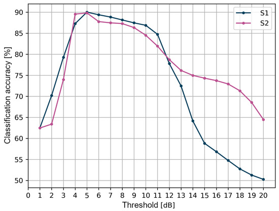 Therefore, the measurements of the received signals taken for the purposes of this research could be directly used to detect LoS and NLoS conditions between the reference module and the wearable module placed on the human body. The detection of NLoS conditions can be achieved by comparing the amplitude of the direct component with the largest received multipath component [42]. The thresholding methods applied include extracting significant features from the channel measurements, which allows for the calculation of the difference between the feature values. Then, based on the comparison of the obtained difference and the determined threshold value, the condition classification is performed. In this study, the difference between and was adopted.