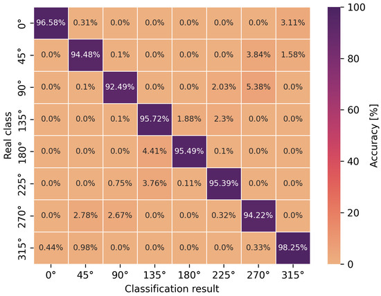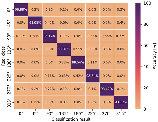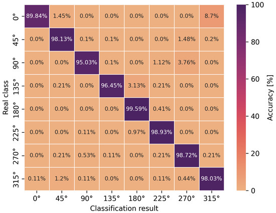 The accuracy of the obtained neural network efficiency results for the classification of eight user orientation angles was determined by a confusion matrix for two types of neural networks and scenarios. It is worth emphasizing at this point that no studies have been found in the scientific literature addressing the classification of orientation angles using UWB and artificial intelligence methods, i.e., concerning position detection in relation to the antenna geometry in UWB wireless body area networks. In Figure 9, Figure 10, Figure 11 and Figure 12, the confusion matrices with accuracy values for individual angles are shown.