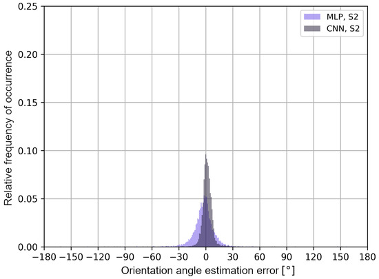 The histograms in Figure 14 and Figure 15 confirm that, for multilayer perceptrons, the distribution of errors is similar in both scenarios and it is characterized by a higher frequency of negative error values of the user’s orientation angle. In the S2 scenario, the convolutional neural network shows a higher frequency of positive error values in the estimation of the user’s orientation angle. In addition, in Table 3, the average values of the classification accuracy of one of the eight angles and the maximum absolute values of the orientation angle estimation errors for a given cumulative value of the distribution function are presented.