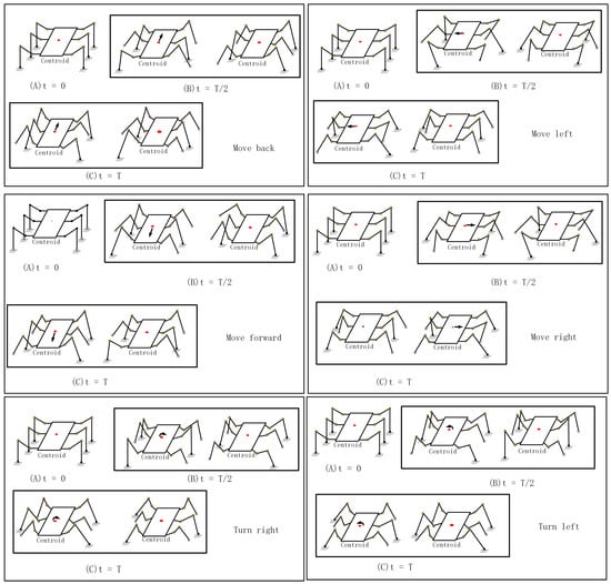 Figure 1 shows movement details of this type of robot, with the supporting legs moving in the direction of the robot’s center of mass (COM) and the swing legs being lifted and moving in the opposite direction. The robot’s continuous motion is maintained by alternating the roles of the supporting and swinging legs.