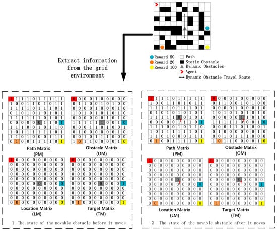 The robot must comprehensively understand its surroundings to navigate its environment effectively. A hexapod robot gathers extensive global information, such as scene layout, comprising dynamic obstacles, static obstacles, navigable waypoints, self-position, target location, and operational status. Four matrices are formulated, based on the extracted current coordinate information from the environment, to represent the prevailing environmental state: the Path Matrix (PM), Obstacle Matrix (OM), Location Matrix (LM), and Target Matrix (TM). The environment is discretized into a grid, with each matrix corresponding to one or more grid cells, where each position in the matrices adopts either of two values: 0, signifying false, and 1, signifying true. Pertinent information is captured in a grid map when extracting a planar section from the multi-dimensional environment, producing four distinct matrices.