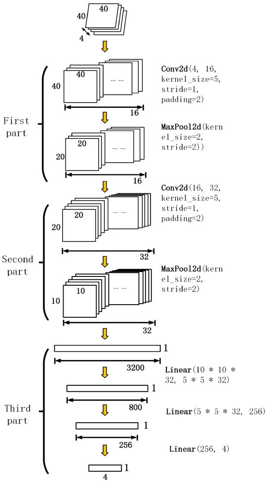 The first step involves feeding the matrix into the neural network’s convolutional layer, which comprises 16 convolutional kernels, each with a size of 5 × 5 and a stride of 1 (stride = 1). Then, the input data are padded with an additional border of two units with zero values (padding = 2). Through the convolution operation, we obtain 16 feature matrices of size 40 × 40, passing through a subsequent max-pooling layer with a pooling window size of 2 × 2 and a stride of 2 × 2, resulting in a 16 × 20 × 20 feature matrix.