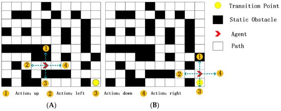 Figure 6, Panel A displays the hexapod robot approaching a transition point with static obstacles above and below. In this scenario, only the action “Right” is the correct choice, as the actions “Up” and “Down” are incorrect. The action “Left” leads the hexapod robot away from the transition point. In this case, random exploration has a 50% chance of making an incorrect decision, a 25% chance of making a suboptimal decision, and only a 25% chance of making the correct decision.