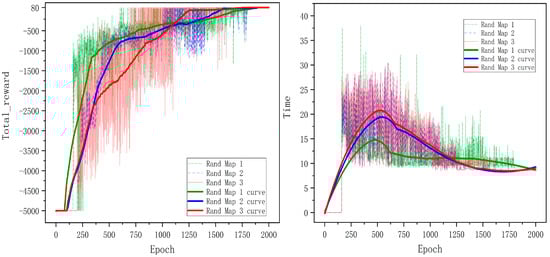 Figure 9, the left image represents the map of total reward, while the right image depicts the map of total movement time. The x-axis represents the number of training epochs, while the y-axis represents the cumulative reward obtained from testing after each epoch. The figure shows that the entire neural network requires approximately 1850 epochs to achieve convergence for each map.
