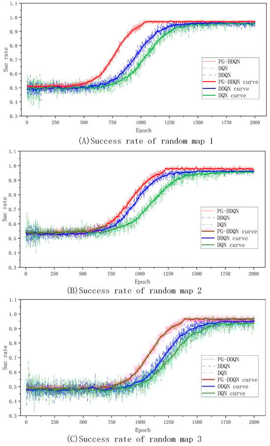 Figure 11 shows the algorithm’s success rate in each random map without touching obstacles and completing path planning. It can be seen that the growth trend of the success rate of the improved algorithm is greater than the standard DDQN and DQN algorithms, and the success rate of the improved algorithm is greater than the standard DDQN and DQN algorithms.