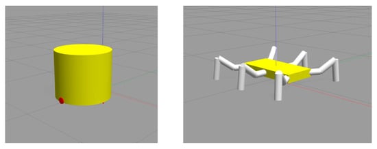 Figure 13 shows the simulation model, with the left side representing the mobile obstacle model, implemented using a wheeled robot as a reference for the dynamic obstacles. The right side of
