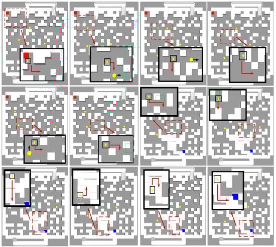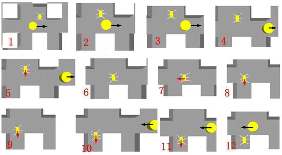 Figure 17. In Step 1, the hexapod robot detects a moving obstacle and promptly halts its movement. In Step 2, it assesses the trajectory of the moving obstacle to determine the best course of action. Once the path is evaluated, the hexapod robot resumes its movement, adhering to the planned path in Step 3. The robot makes necessary adjustments to its body path from Steps 4 to 7 to effectively navigate the obstacle. The path-planning process within the moving obstacle’s range is successfully executed from Steps 9 to 12.