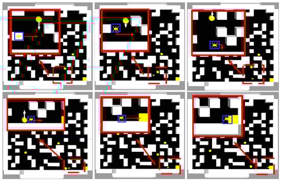 In this section, we present the following conclusions drawn through actual testing: As it can be seen from the verification diagram above, the robot did not hit stationary obstacles when moving. When encountering interference points, the robot’s route can be changed to avoid them, and dynamic obstacles can also be avoided. The feasibility of this improved approach in effectively navigating multi-dimensional terrain is demonstrated.