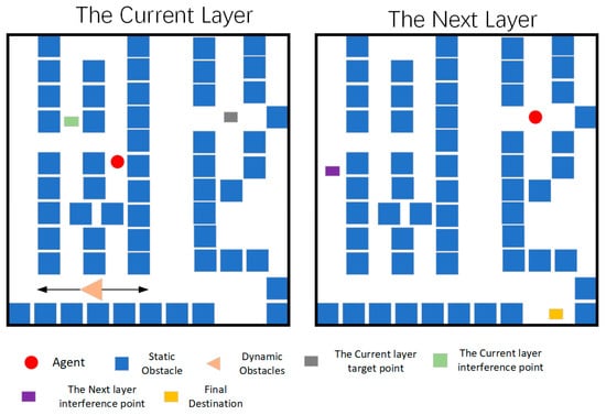 Table 1. The left image shows the map of the current plane, while the right image depicts that of the next plane. Each layer plane has dimensions of 40 × 40, incorporating four dynamic obstacles. The exploration rates for each map are specified in