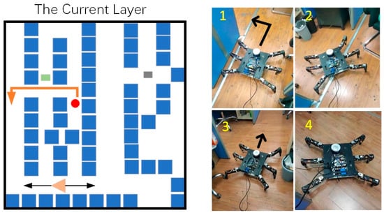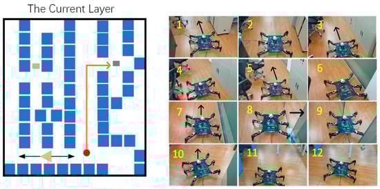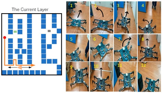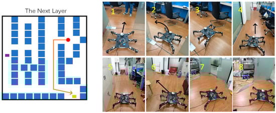 Figure 14. In this validation process, the algorithm can handle step-type points for plane traversal. The black box represents the hexapod robot, while the red lines illustrate the paths planned by the algorithm. The orange squares in the current layer indicate the entrances to incline-type point 1, and those in the subsequent layer, the exits from incline-type point 1. Similarly, the blue squares in the current layer mark the entrances to incline-type point 2, while in the following layer, they represent the exits from incline-type point 2. Furthermore, the green squares in the current layer indicate the entrances to step-type points, while in the next layer, they indicate the exits from the step-type points.