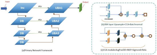 Cost volume regularization network: (a) the overall network, (b) the UBA layer, and (c) the CCA module in the UBA layer.