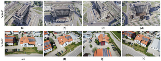 To evaluate the application of our model in the field of UAV remote sensing, we also performed the corresponding test in the main scene reconstruction of buildings, as shown in Figure 8. Here, the image of Scene 1 was obtained from a public dataset provided by the well-known UAV photogrammetry company PIX4D [41]. The camera model was DJI FC6310, the world coordinates were selected as WGS84/UTM zone 17N, and the image resolution was 5472 × 3478. The image for Scene 2 was captured with an AV-900 model drone with a Sony NEX-5T camera model; the world coordinate system was also selected as WGS84/UTM zone 17N, the average ground sampling distance (GSD) was 1.66 cm/0.65 in, and the image resolution was 4912 × 3264.
