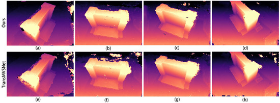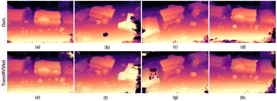 Depth prediction image of the scene in Figure 15, comparing our improved algorithm with TransMVSNet, where (a–d) are the results of our algorithm and (e–h) are the results of the TransMVSNet.