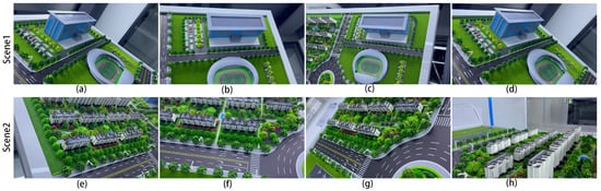 Self-constructed wrap-around robotic arm overhead shooting scene dataset: (a–d) are Scene 1, which mainly includes schools and stadiums; (e–h) are Scene 2, which mainly includes residential areas.