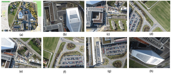 Next, we acquired a dataset of push–sweep photography captured with a drone and a publicly available dataset from the photogrammetric company Pix4d, whose camera model is the Canon IXUS 127 HS, and selected the world coordinate system as WGS84/UTM zone 32N. Because the ground sampling resolution is small and the scene as a whole is very large, we selected a few images to be displayed in Figure 15.