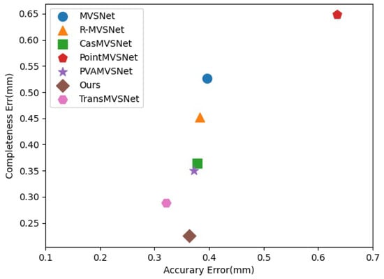 In the DTU dataset, there are two metrics to evaluate the accuracy of the point cloud: Acc and Comp. The Acc metric is used to find the points in the reconstructed point cloud according to the points in the reconstructed point cloud and evaluate the accuracy of the point cloud by the distance between the points in the reconstructed point cloud and the points in the reconstructed point cloud. And the Comp metric is used to find out whether there are any corresponding points in the reconstructed point cloud based on the points in the true value of the point cloud and to evaluate the integrity of the point cloud by the number of corresponding points. The lower the values of the metrics, the better, as this means that the distance between the reconstructed resultant point cloud and the true value of the point cloud is smaller and thus means that the recovered point cloud is more accurate. The comparison of our algorithm with several other algorithms is shown in Figure 21.