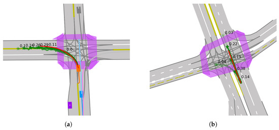 where GN( ) stands for GroupNorm. A dual-branch multimodal prediction architecture is employed, where one branch is responsible for estimating possible trajectories, and the other for assigning confidence scores to these trajectories. Figure 4 is a schematic diagram illustrating the model’s prediction of vehicle trajectories at an intersection and their associated confidence scores, where the green lines represent the predicted trajectories, the green stars indicate the predicted goals and the confidence scores for different trajectories are denoted by the numerical values along the paths. The following loss function is used to assess and optimize the accuracy of the predicted trajectories: