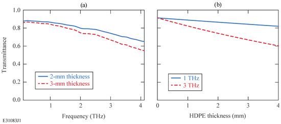 (a) Transmittance (including surface reflections) with respect to THz frequency for an HDPE material; (b) THz transmittance (including surface reflections) with respect to HDPE material thickness. The data for these plots are adopted from [17,19].