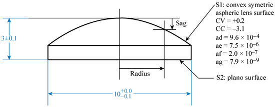 We designed a pair of identical plano-aspheric lenses using a lens-design software called optics software for layout and optimization (OSLO version 24.1.0) [20]. OSLO enabled us to analyze our design and subsequently empirically test that our lenses can obtain a small focal spot with high spatial resolution. The geometry of the aspheric lens is provided in Figure 2.